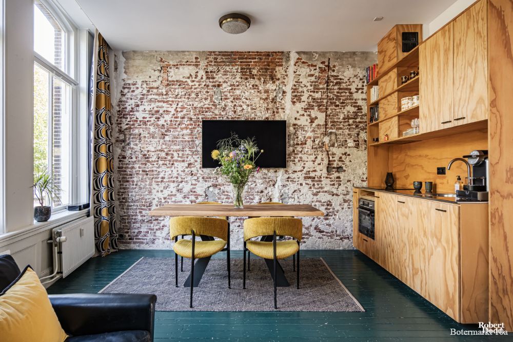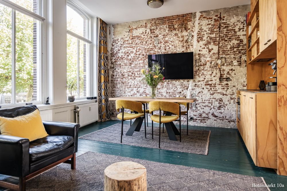 The front room is open plan with a rough, exposed brick wall. This gives the apartment an industrial warehouse feel.