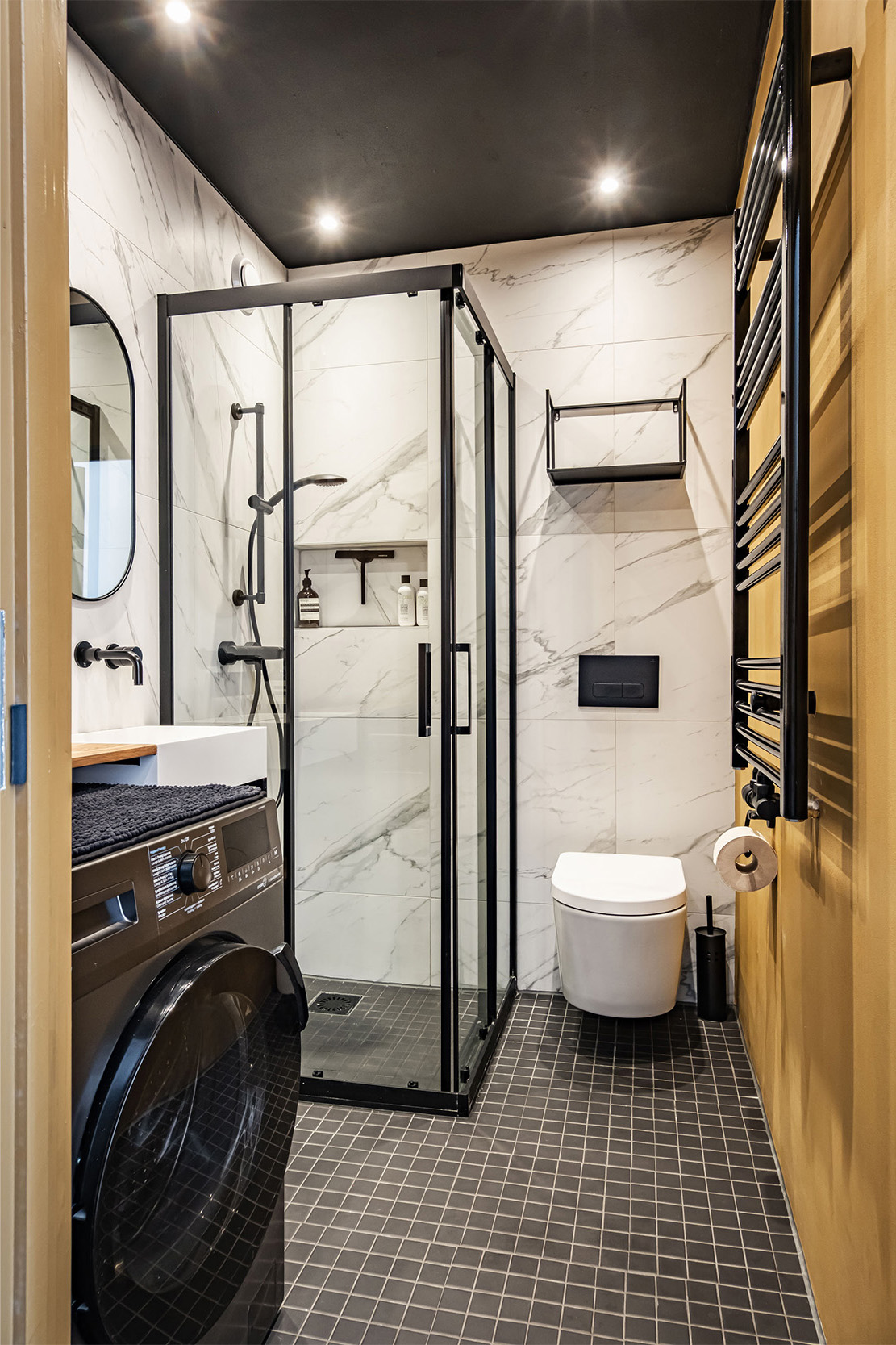 This apartment is 38 square metres but the huge windows both sides make it spacious, light and free.